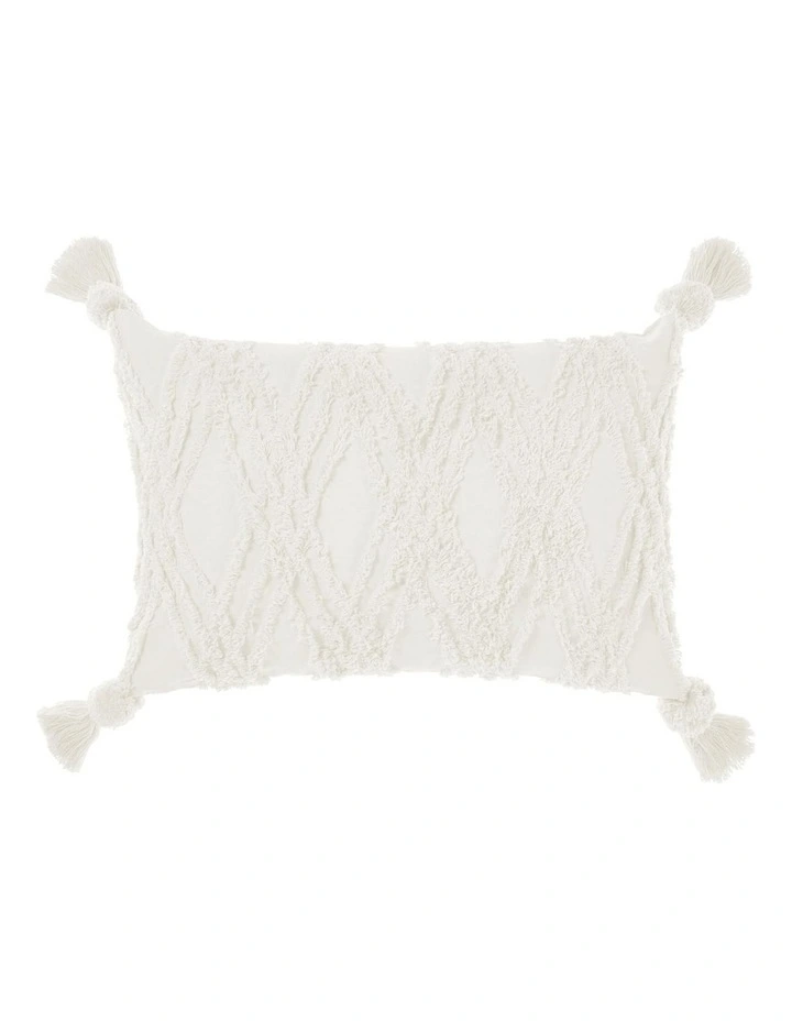 A distinctive geometric pattern, Solange in white is complemented with stylish corner tassels a quintessential cushion for your bedroom or living space.