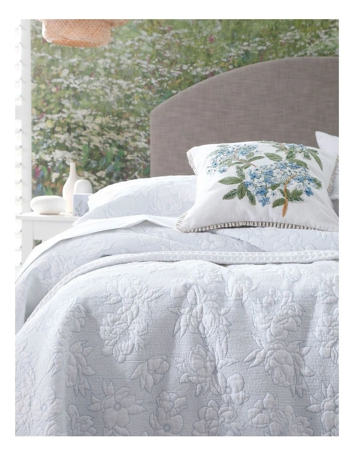 A posy of cotton embroidered flowers in blue across a duck-hued cotton ground, Posy will give any space an elevated, charming feel.Β